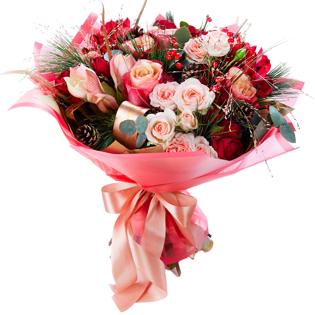 Роза одноголовая персиковая, роза кустовая розовая и красная, альстромерия красная, гиппеаструм, аспидистра, зелень, эвкалипт, шишки. Упаковка (лента, пленка, крафт, сетка, пленка матовая)
