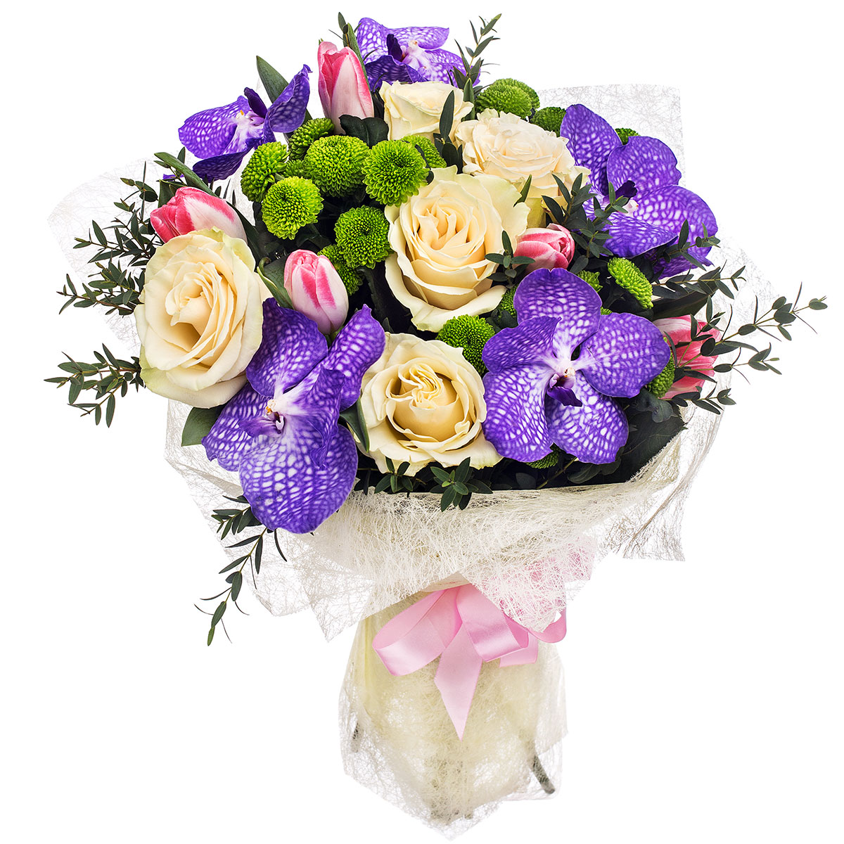 Роза одноголовая белая, орхидея ванда фиолетовая, хризантема кустовая зеленая, тюльпан розовый, зелень. Упаковка (лента, пленка, крафт, сетка, пленка матовая)