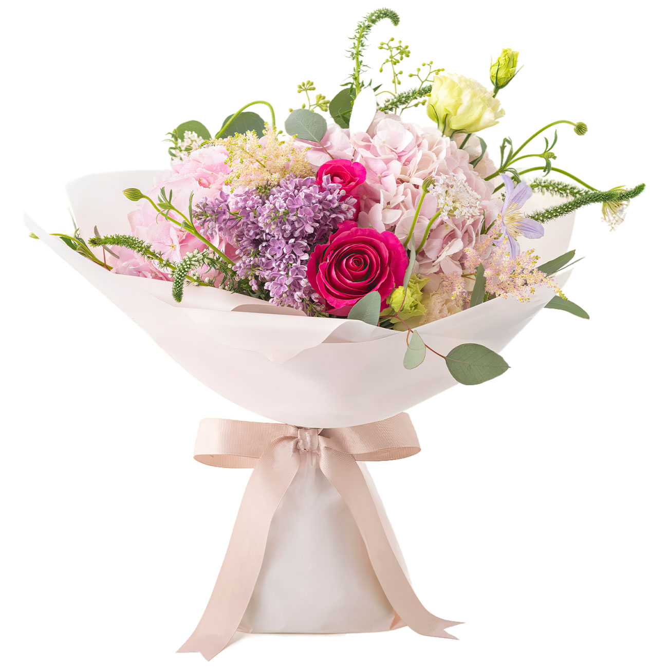 Гортензия розовая, роза южноамериканская розовая, сирень, клематис сиреневый, женьшеневый цветок, эустома белая, вероника, эвкалипт. Упаковка (лента, пленка, крафт, сетка, пленка матовая)