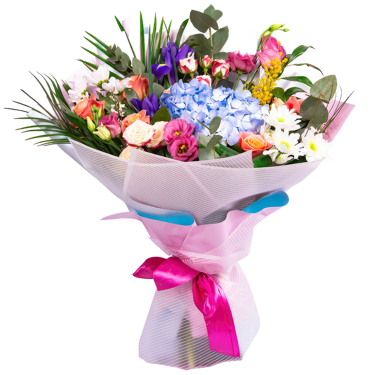 Гортензия голубая, роза галузковая, эустома розовая, роза Мисс Пигги, мимоза, рускус, эвкалипт, хризантема белая, ирис фиолетовый, рубелины. Упаковка (лента, пленка, крафт, сетка, пленка матовая)