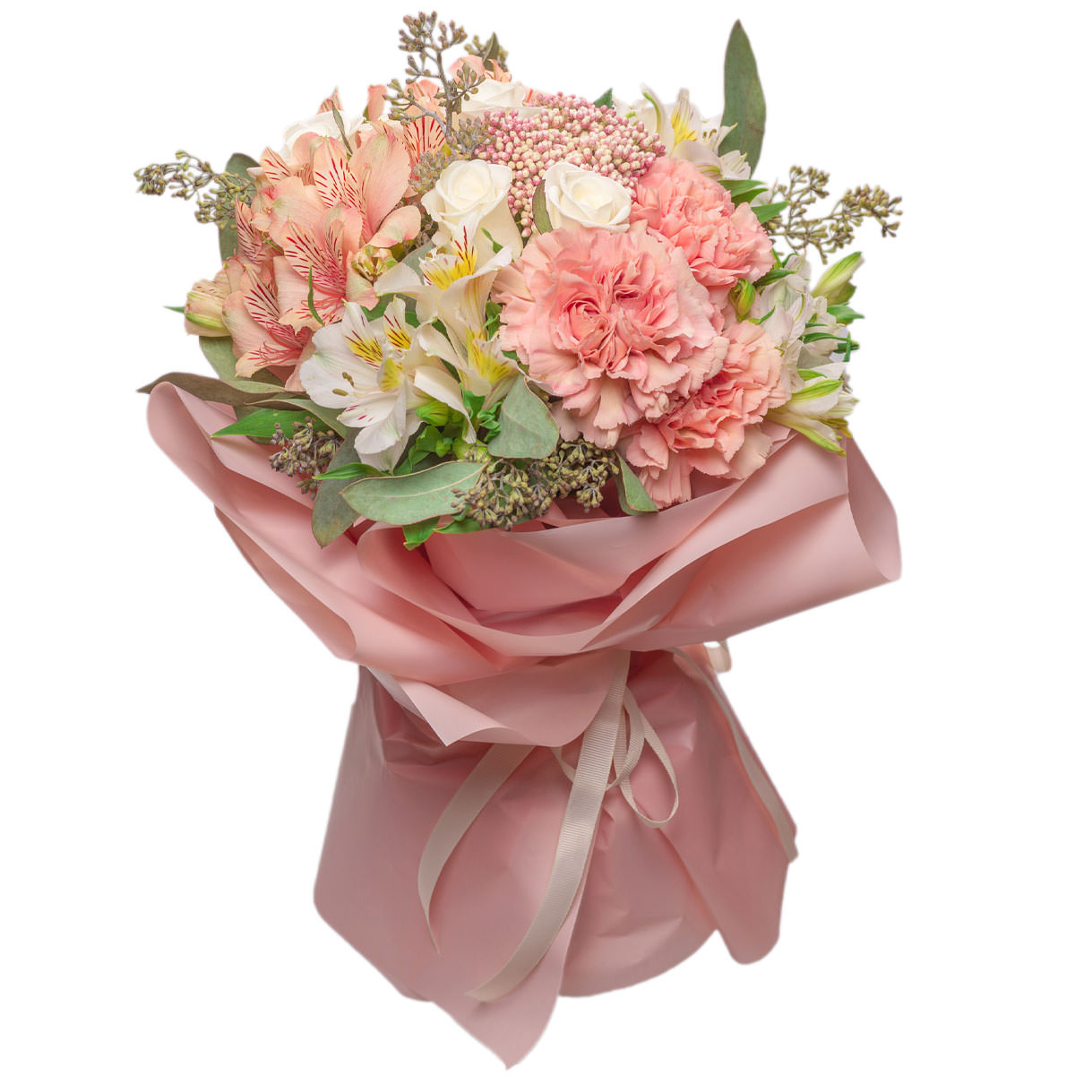 | Состав | Альстромерии, Гвоздики, Розы, Эвкалипт |