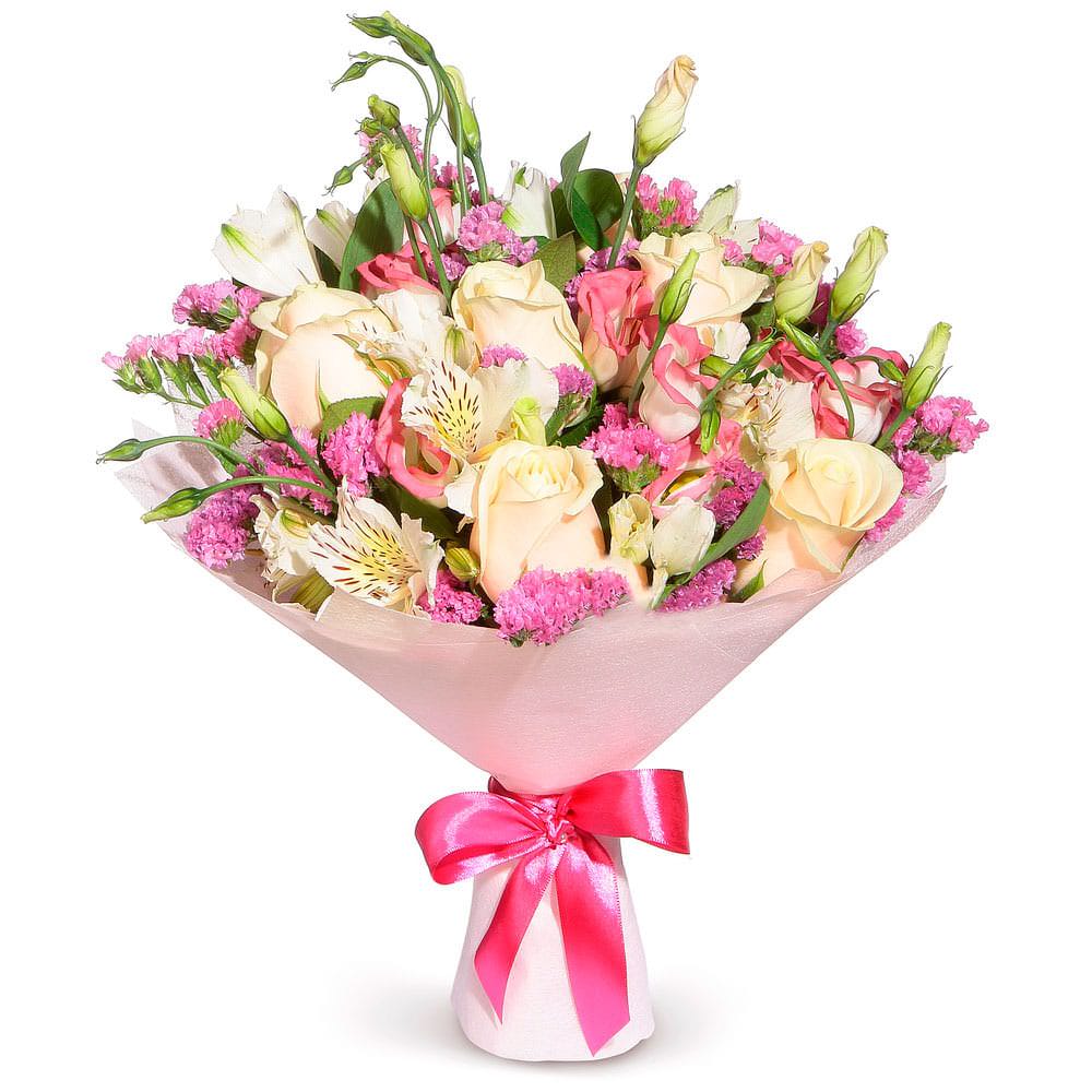Лизиантус розовый, роза одноголовая кремовая, альстромерия белая, статица. Упаковка (лента, пленка, крафт, сетка, пленка матовая)