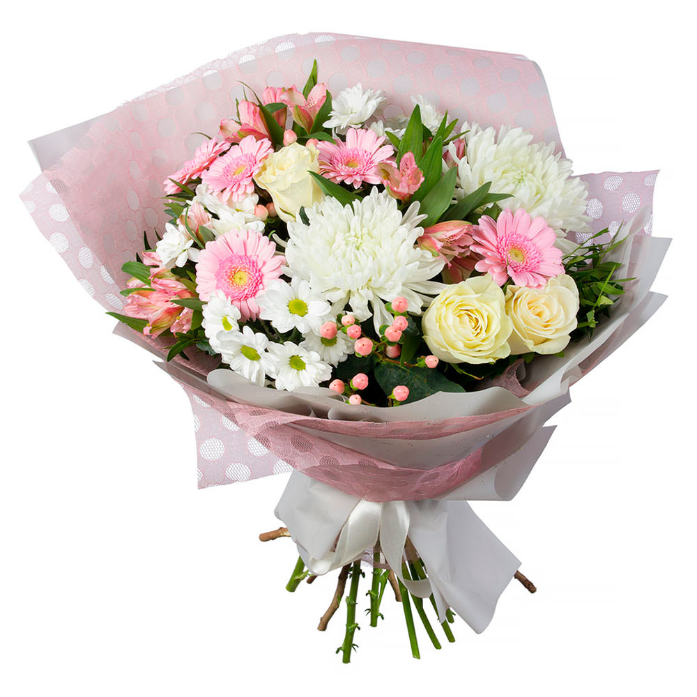 Роза одноголовая кремовая, гербера розовая, хризантема кустовая белая, альстромерия, хризантема одноголовая белая, альстромерия розовая, гиперикум. Упаковка (лента, пленка, крафт, сетка, пленка матовая)