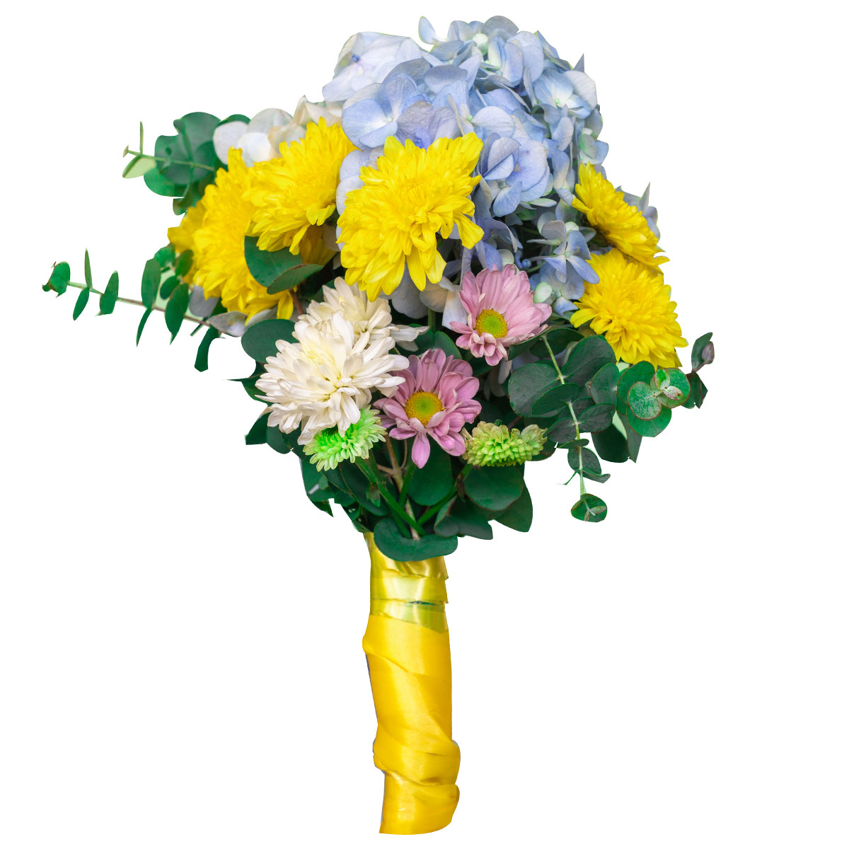 Гортензия голубая, хризантема кустовая желтая, белая и розовая, эвкалипт. Упаковка (лента, пленка, крафт, сетка, пленка матовая)