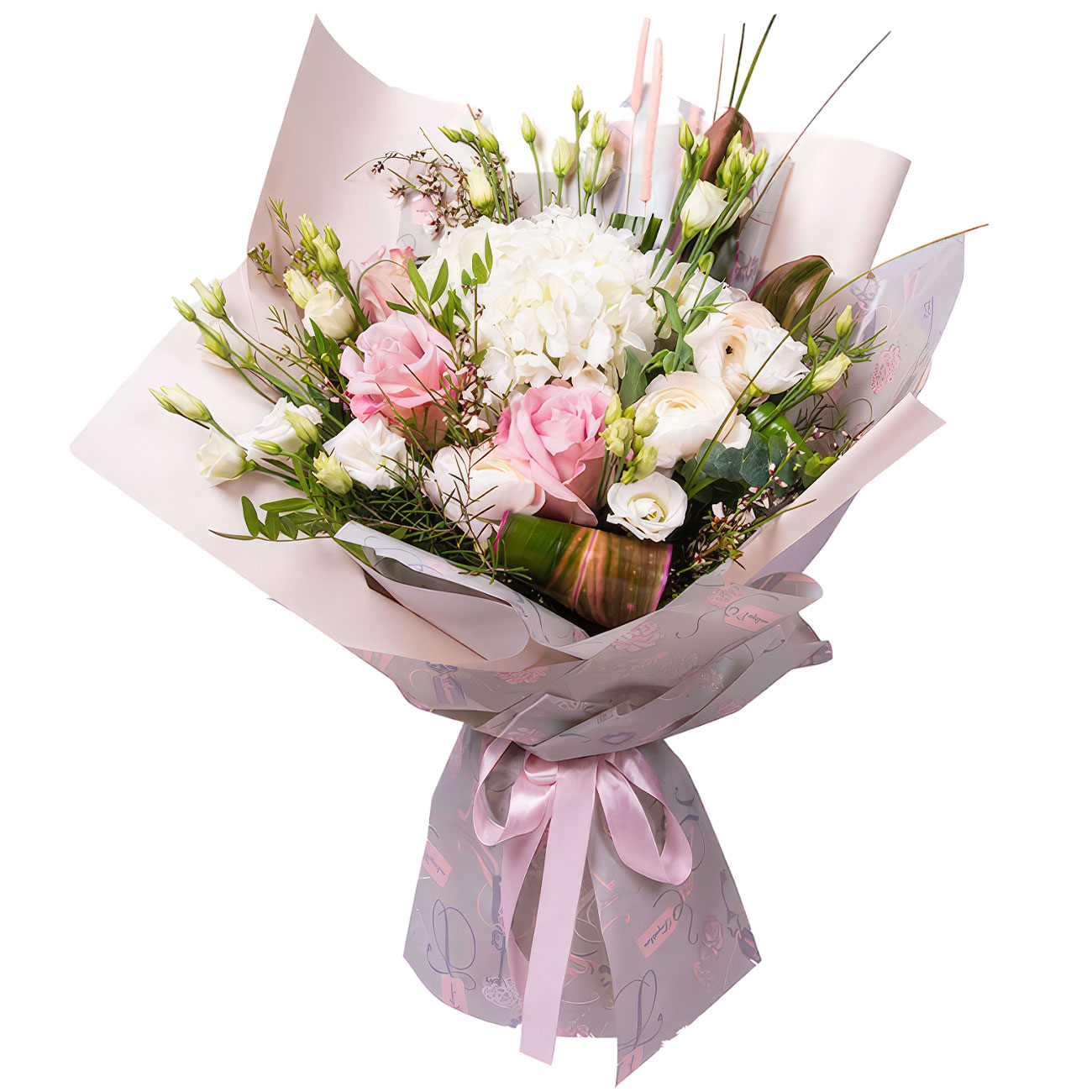 Роза одноголовая розовая, гортензия белая, ранункулюс белый, эустома белая, хамелацио, зелень и экзотика. Упаковка (лента, пленка, крафт, сетка, пленка матовая)