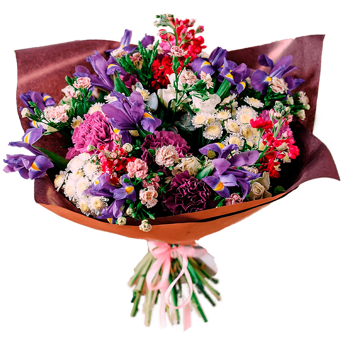 Ирис фиолетовый, маттиола красная, гвоздика темно-сиреневая, гвоздика кустовая мини кремовая, роза кустовая, ромашка, зелень. Упаковка (лента, пленка, крафт, сетка, пленка матовая)