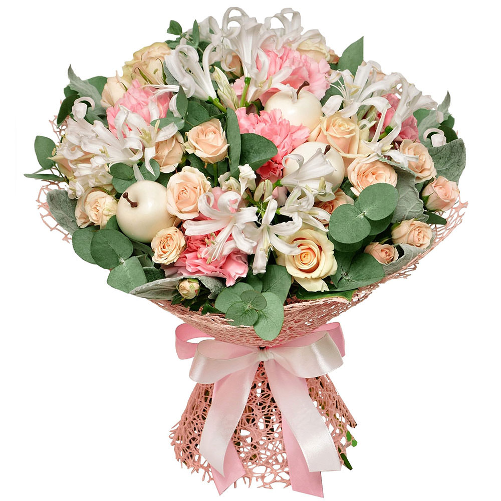 Роза кустовая кремовая, роза одноголовая кремовая, гвоздика розовая, альстромерия, эвкалипт, декоративный дополнения. Упаковка (лента, пленка, крафт, сетка, пленка матовая)