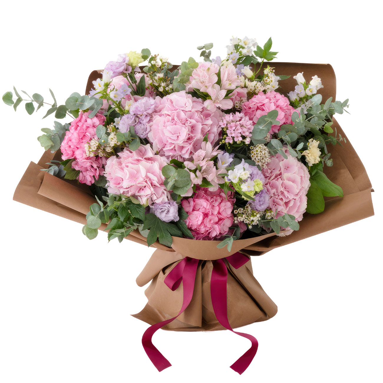Гортензия светло-розовая голландская и ярко-розовая, крестоцвет розовый голландский, маттиола сиреневая, ваксфлауэр, колокольчик белый, эвкалипт. Упаковка (лента, пленка, крафт, сетка, пленка матовая)