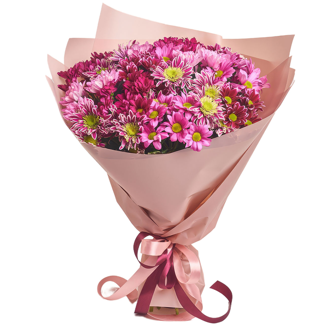 Хризантема розовая микс (несколько оттенков розового). Упаковка (лента, пленка, крафт, сетка, пленка матовая)