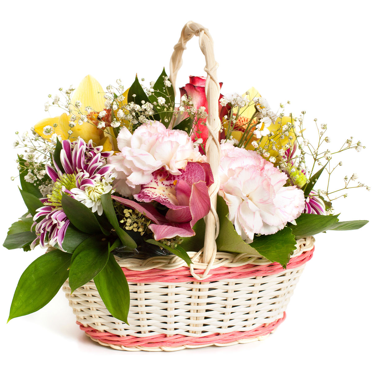 Орхидея розовая и желтая, гвоздика розовая, роза одноголовая розовая, хризантема фиолетовая, гипсофила. Упаковка (Корзина, оазис, ящик).