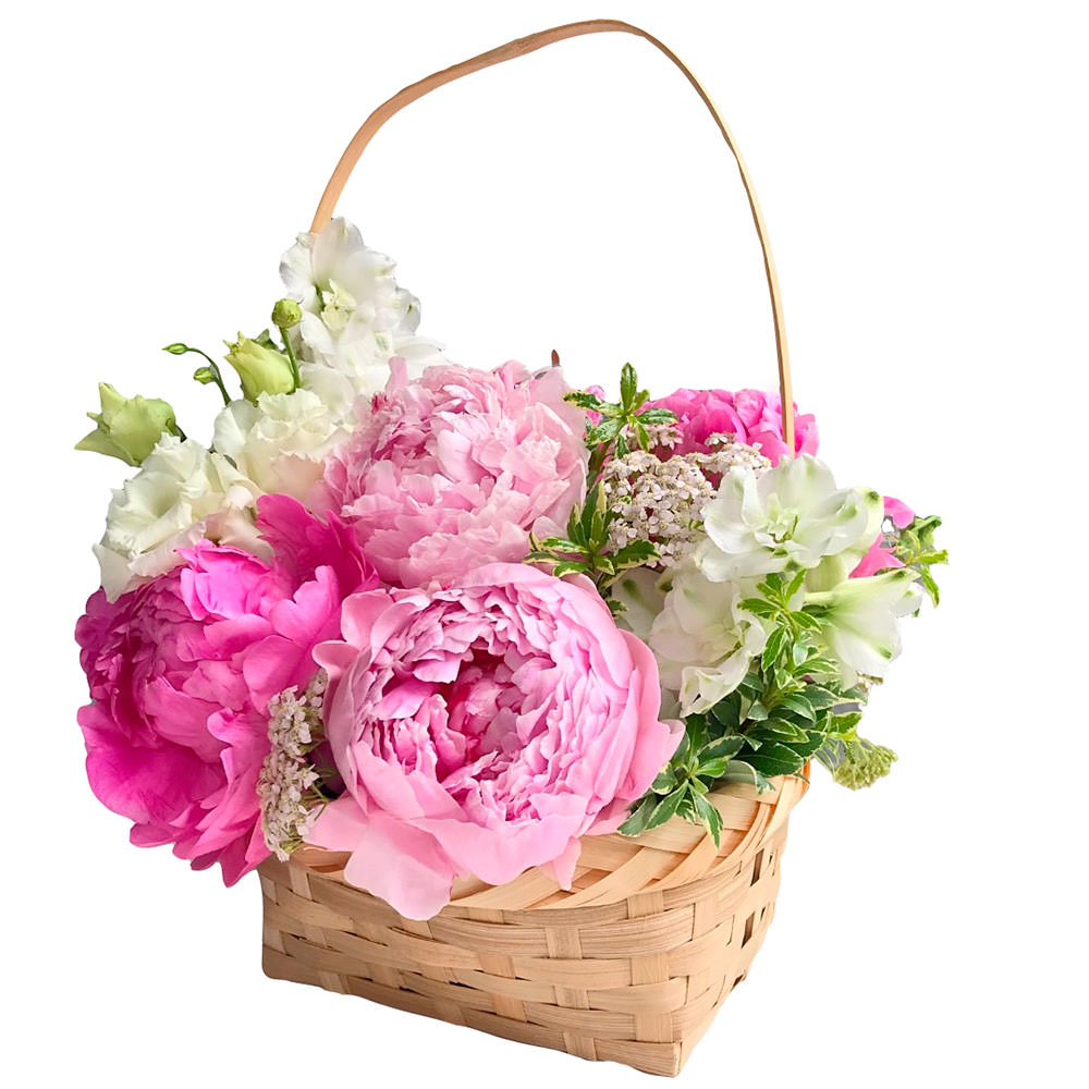 Пионы микс (розовый, белый), эустома белая, поттоспорум. Упаковка (Корзина, оазис).