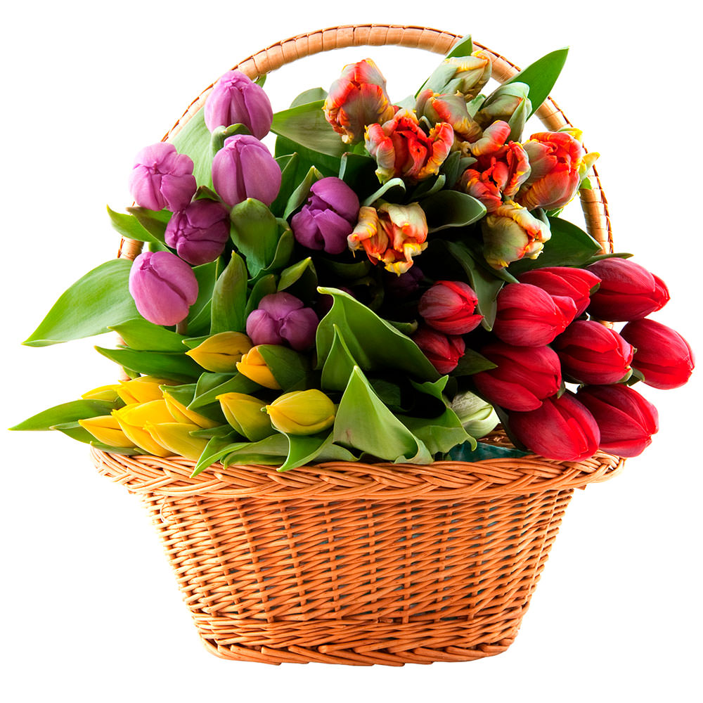 Цветы в корзинке «Микс тюльпанов» с доставкой по г Александровск-Сахалинский: вы можете купить букет в супермаркете цветов «Флормания» по цене от 3599 руб.